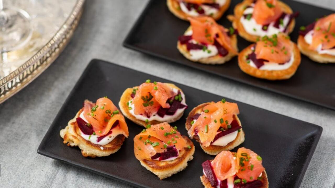 Recette 1 : Mini blinis rose betterave, mousse fraîche au saumon