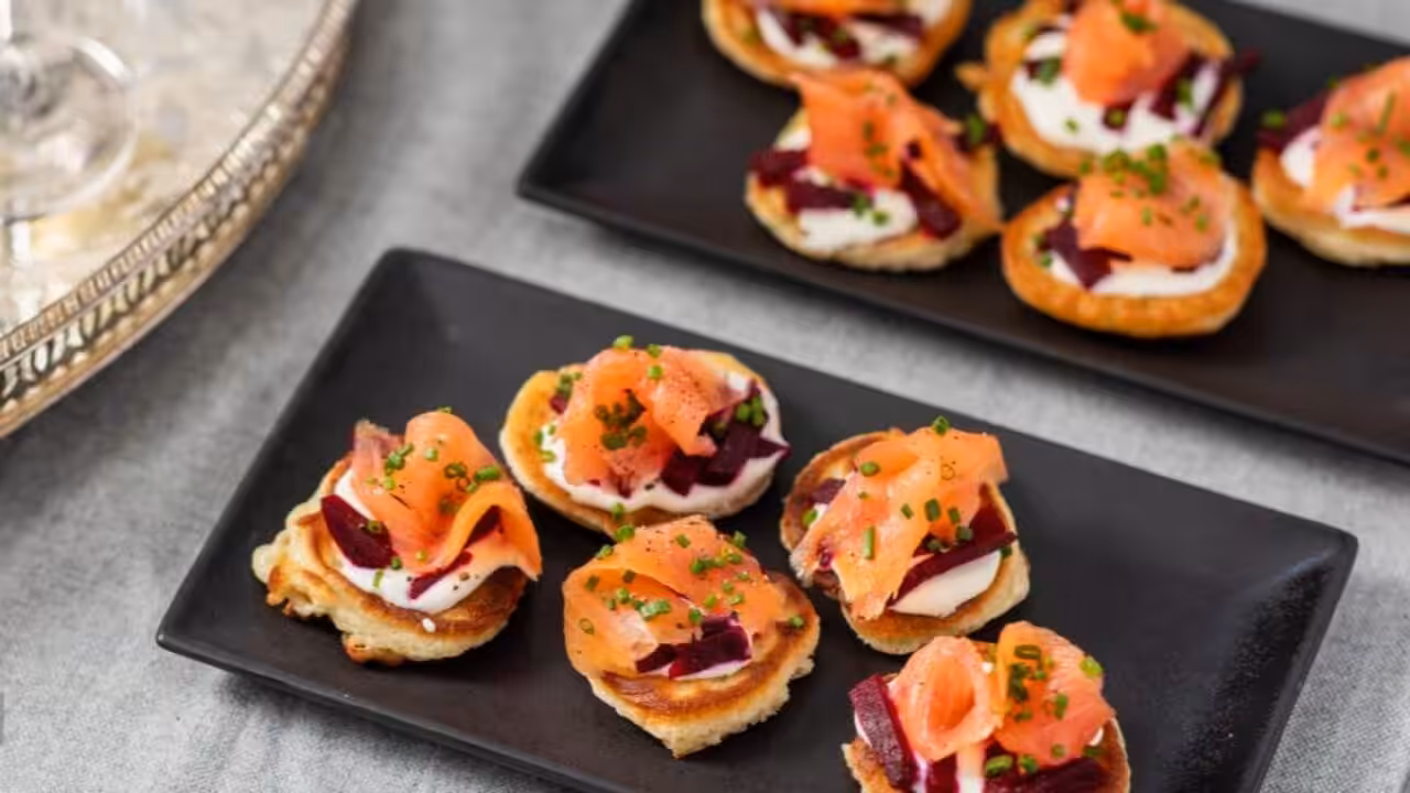 Recette 1 : Mini blinis rose betterave, mousse fraîche au saumon