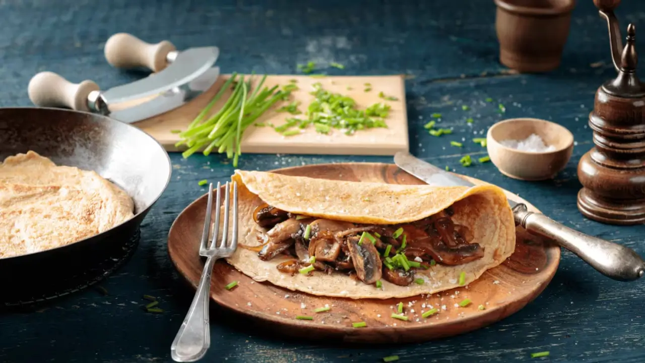 • Garniture : posez 2–3 c. à soupe de champignons au centre de chaque crêpe. Parsemez de ciboulette ciselée. Pliez en triangle ou roulez comme un wrap.