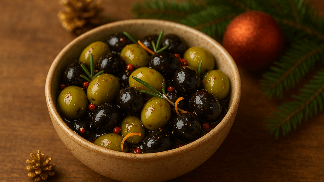 1. Olives marinées aux parfums de fête :