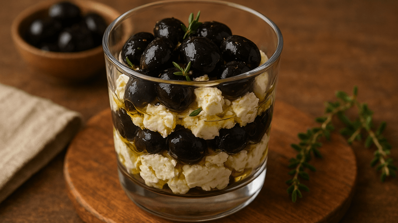 Ces verrines sont un concentré de fraîcheur. Fouettez la feta avec un peu de crème pour obtenir une texture lisse, versez dans de petites verrines, ajoutez un filet de tapenade noire et parsemez quelques herbes. Faciles à préparer, elles apportent légèreté et élégance à votre apéritif.