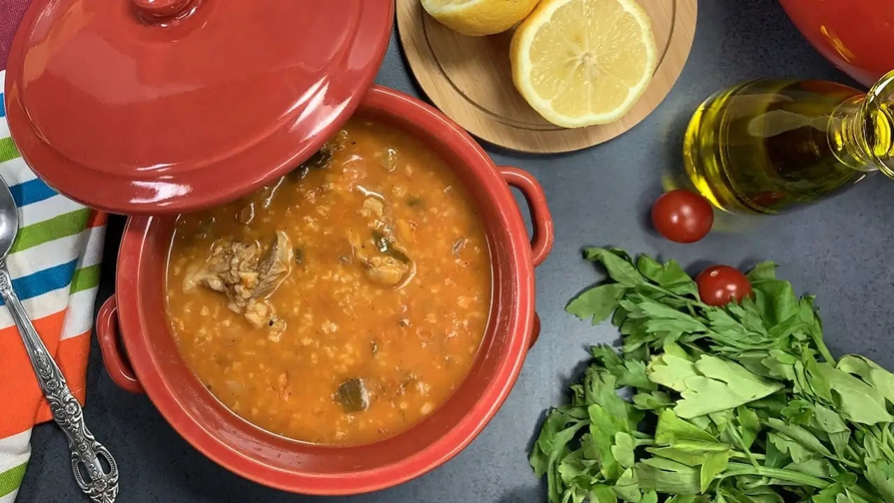 Cette soupe dense, fumante et généreuse, à base de frik : ce blé vert jeune, torréfié et concassé, mijote longuement avec des morceaux d’agneau fondants, un bouillon tomate riche, des pois chiches crémeux et une pluie finale d’herbes fraîches. Dès les premières minutes de cuisson, son parfum envahit la cuisine : notes fumées de frik, acidité douce des tomates, chaleur des épices et fraîcheur de la coriandre et de la menthe. C’est le genre d’odeur qui fait dire : saha avant même de goûter.